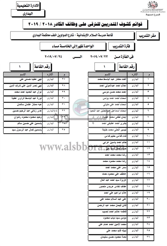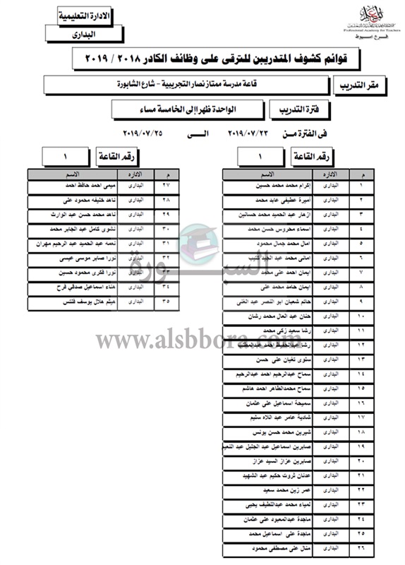 اعلنت الاكاديمية المهنية للمعلمين عن كشوف اسماء المستهدفين لتدريبات الترقى 2018 / 2019 والحاصلين على وظيفة كادر قبل 31 / 12 /2013 فى الفترة من 23 / 7 / 2019 حتى 25 / 7 / 2019 من الساعة الواحده ظهرا حتى الساعة الخامسة عصرا كل كشف موضح فيه مكان التدريب