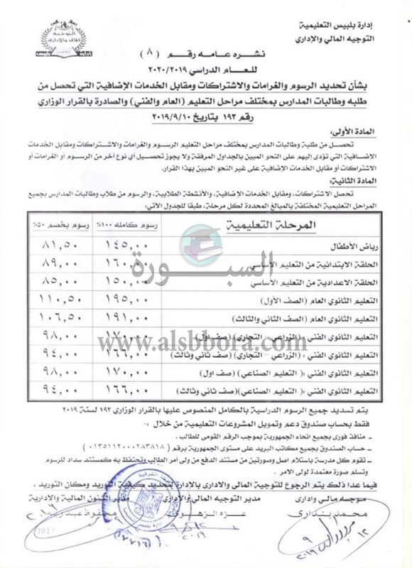 وكانت الدكتور طارق شوقى، وزير التربية والتعليم والتعليم الفنى، قد اصدر القرار رقم 193 لسنة 2019 بشأن سداد المصروفات الدراسية والخدمات للطلاب عن العام الدراسى الجديد 2020/2019، والذى سوف ينطلق يوم السبت والاحد المقبلين.