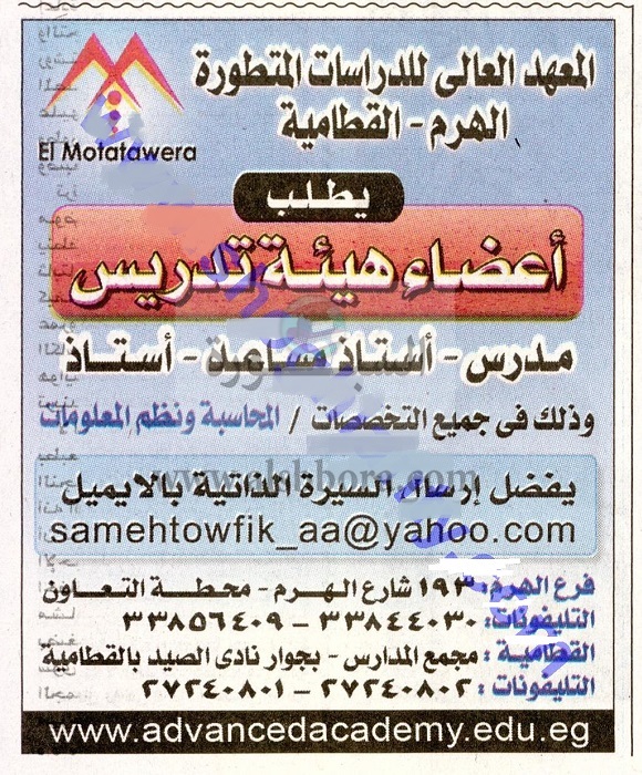 يعلن المعهد العالى للدراسات المتطورة "الهرم/ القطامية" عن حاجته الى اعضاء هيئة التدريس من المدرس الى الاستاذ، وعلى الراغبين فى الحصول على الوظيفة ارسال السيرة الذاتية عبر الايميل المنشور فى جريدة اخبار اليوم السبت الموافق 15 فبراير الجارى.