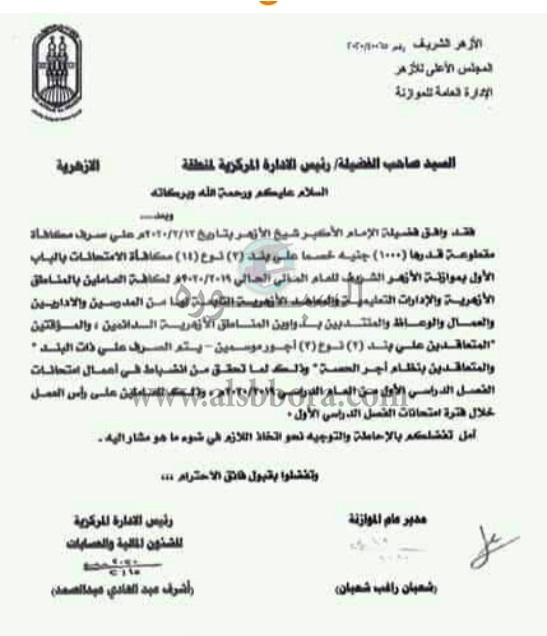 وافق الإمام الأكبر الدكتور أحمد الطيب شيخ الأزهر على صرف مكافأة 1000 جنيه لكل العاملين بالأزهر الشريف، وذلك لما قاموا به من جهود في إنجاح امتحانات الفصل الدراسي الأول.