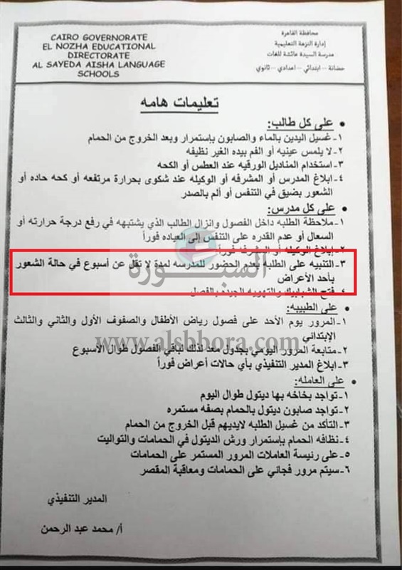 3- التنبيه على الطلاب بعدم الحضور الى المدرسة لمدة لا تقل عن اسبوع فى حالة الشعور باحد الاعراض.