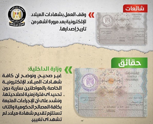 وتواصل مركز المعلومات مع وزارة الداخلية لكشف حقيقة الاخبار المتداولة بشأن وقف العمل بشهادات الميلاد الالكترونية بعد مرور 6 اشهر من تاريخ اصدارها، والتى نفت هذه الاخبار جملة وتفصيلا.
