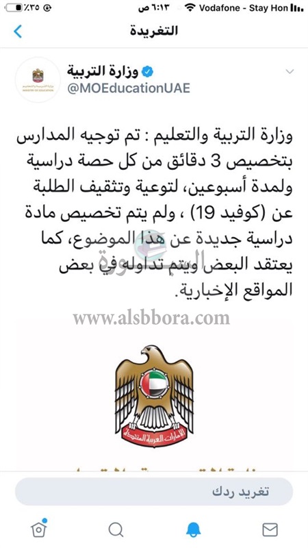 واكدت وزارة التربية بالامارات انه تم توجيه المدارس بتخصيص 3 دقائق من كل حصة دراسية ولمدة اسبوعين لتوعية وتثقيف الطلاب عن كوفيد 19 الشهير اعلاميا بفيروس كورونا.