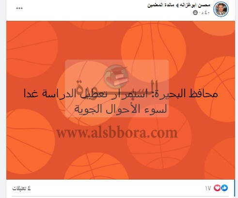 قال الناشط التعليمي محمود أبو غزالة، إن محافظ البحيرة أصدر قرار استمرار تعطيل الدراسة غدا لسوء الأحوال الجوية.