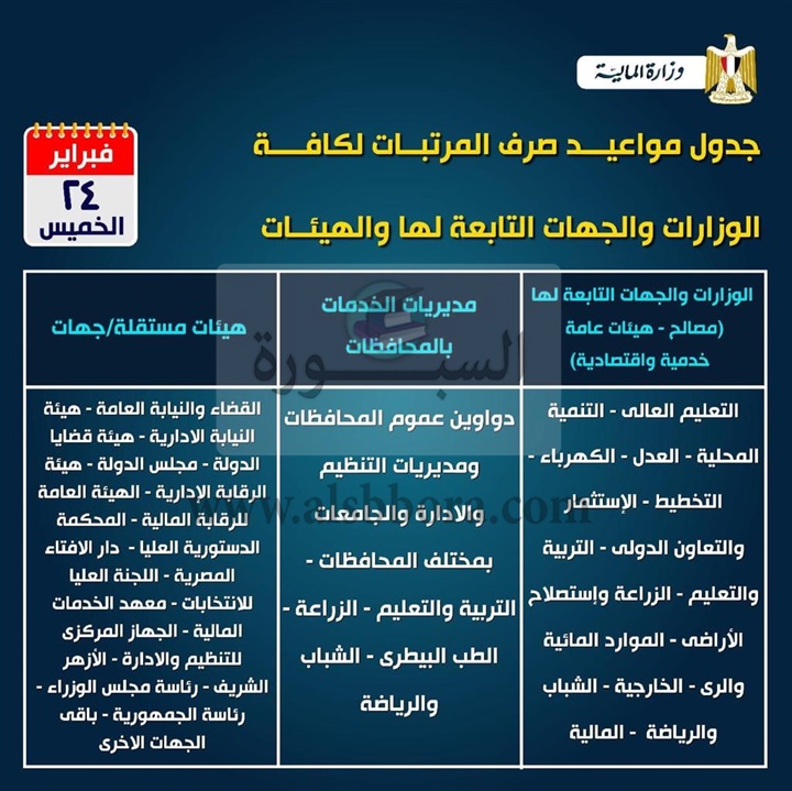 نشرت وزارة المالية جدول المواعيد الجديد لصرف مرتبات المعلمين وأساتذة الجامعات لشهر فبراير وتضمن الجدول التالي: