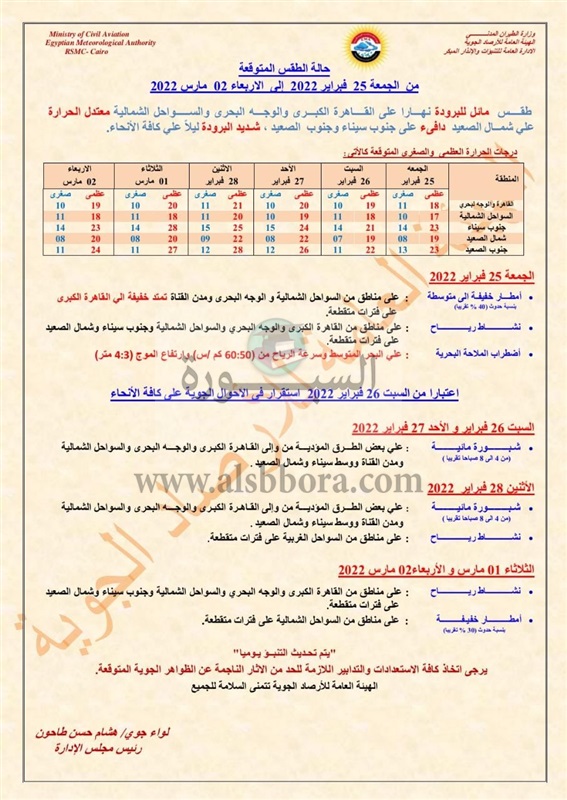 تنشر "السبورة" التقلبات الجوية خلال الساعات المقبلة طبقا لبيان هيئة "الأرصاد" وتضمن بيان التالي: