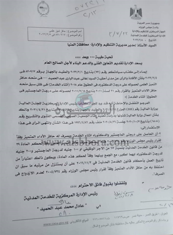 تداولت عدد من جروبات حملة الماجستير والدكتوراه علي مواقع التواصل الاجتماعي، مستند بقرارا مالي من مجلس الوزراء بتاريخ 8-2-2022 بشأن حملة الماجستير والدكتوراه والذي تضمن التالي: