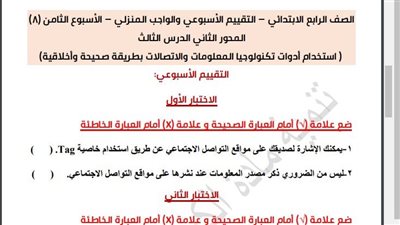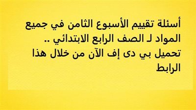 أسئلة تقييم الأسبوع الثامن في جميع المواد لـ الصف الرابع الابتدائي.. تحميل بي دى إف الآن من خلال هذا الرابط