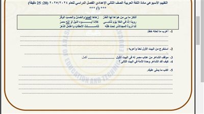 مراجعات نهائية.. أسئلة تقييم الأسبوع الثاني لغة عربية لـ الصف الثاني الإعدادي