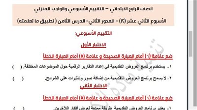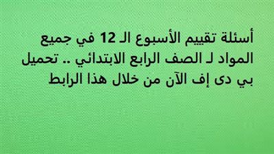 أسئلة تقييم الأسبوع الـ 12 في جميع المواد لـ الصف الرابع الابتدائي.. تحميل بي دى إف الآن من خلال هذا الرابط