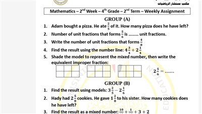 مراجعات نهائية.. لطلاب الصف الرابع الابتدائي.. أسئلة تقييم الاسبوع الثاني في الرياضيات ترم ثاني