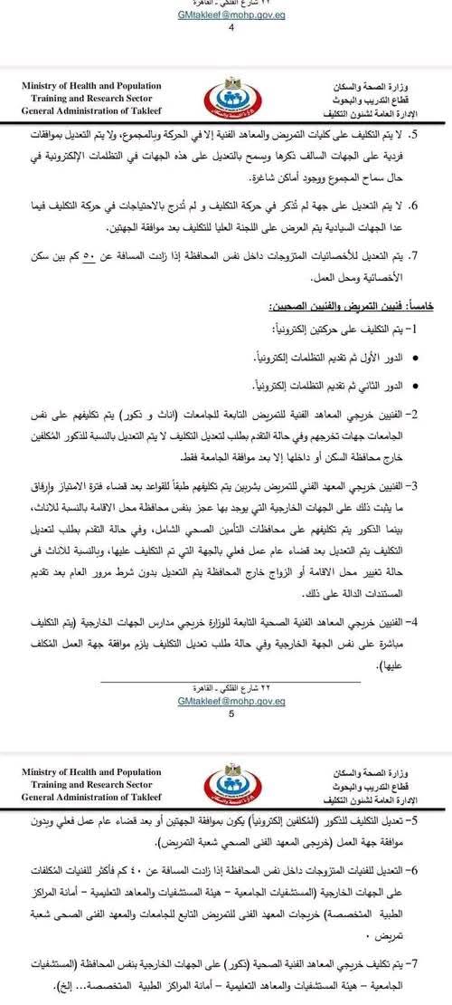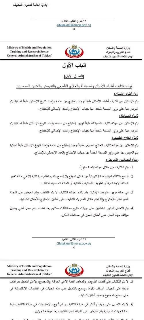 قانون تكليف المهن الطبية.. في إطار الهيكلة التنظيمية للقطاع الصحي في مصر، تم إصدار قانون تكليف المهن الطبية الذي يحدد آلية التعيين للمهن الطبية المختلفة وفقًا للاحتياجات الفعلية للقطاع الصحي. وقد تم تحديد التعيينات بشكل يتناسب مع احتياجات السوق ومتطلبات النظام الصحي في البلاد، على النحو التالي: