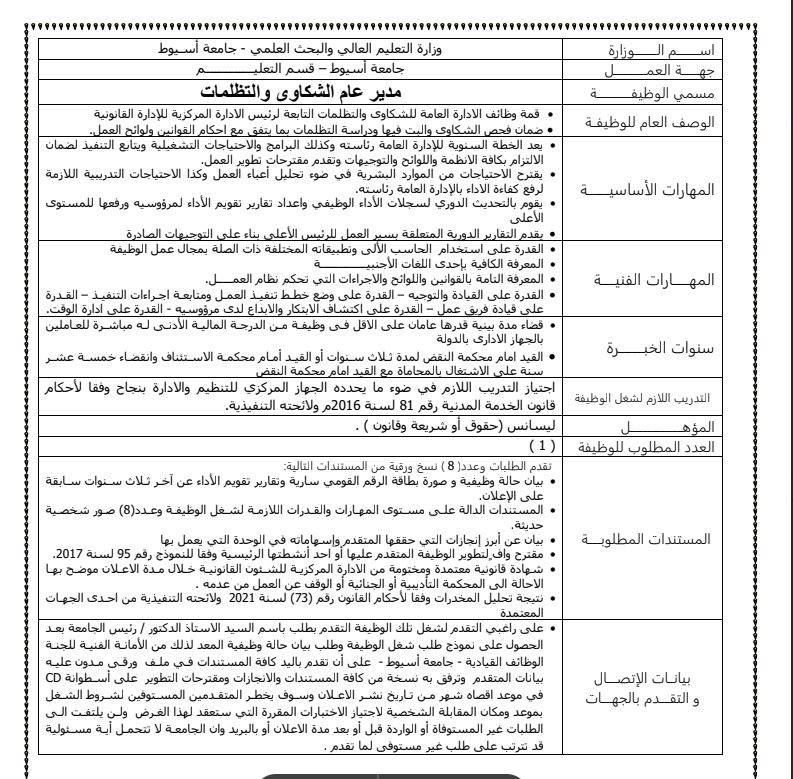 - أخبار وظائف جامعة أسيوط اليوم