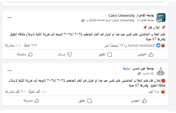 أعلنت الجامعات الحكومية الشهر الماضي، في "بيان هام"، عن صرف مكافأة قدرها 67 جنيهًا للطلاب المتفوقين الحاصلين على تقدير جيد جدًا أو ممتاز في العام الجامعي الحالي، مع مطالبة الطلاب بالتوجه إلى خزينة الكلية لإستلامها