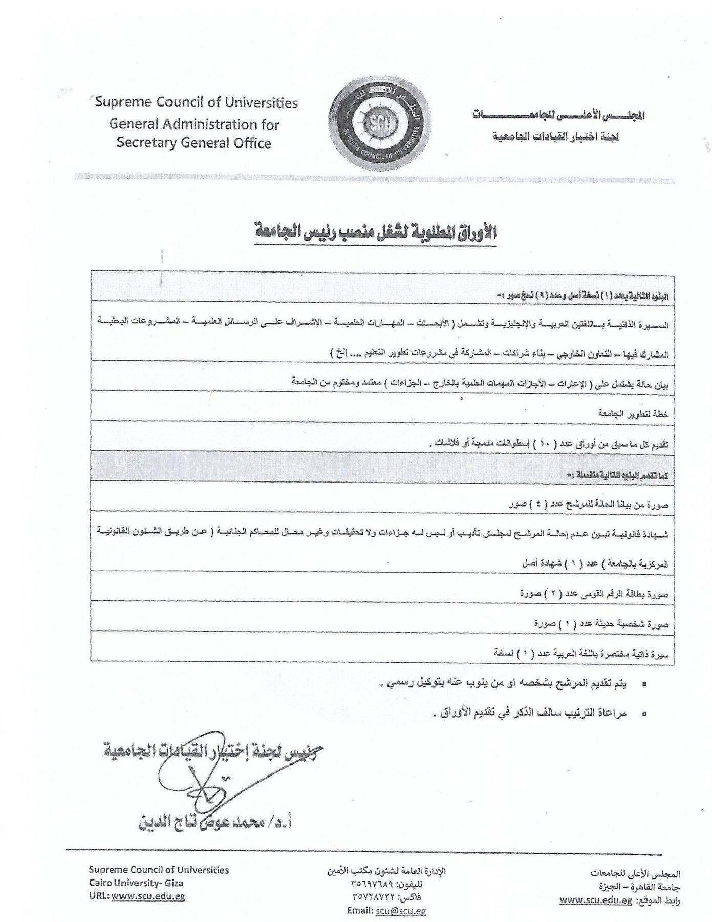 أضاف الدكتور محمد عوض تاج الدين رئيس لجنة إختيار القيادات الجامعية، أن الأوراق المطلوبة الأوراق المطلوبة لشغل منصب رئيس الجامعة