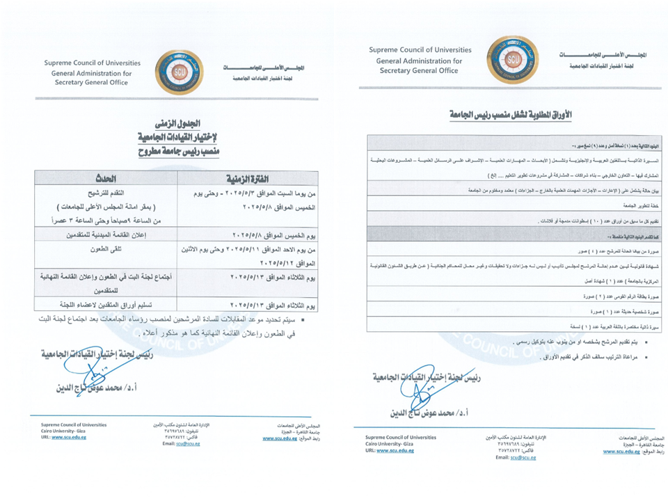 الجدول الزمنى لإختيار القيادات الجامعية لمنصب رئيس جامعة