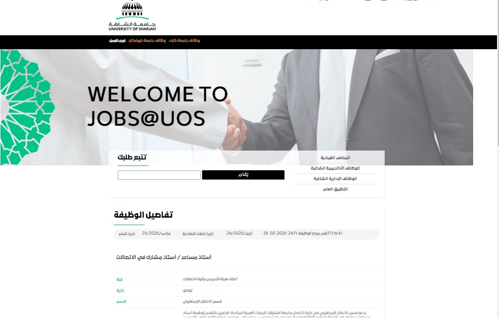 تدعو جامعة الشارقة جميع الأكاديميين المهتمين من الجنسين والجنسيات المختلفة، والذين تتوفر لديهم الكفاءة والخبرة الأكاديمية المطلوبة، إلى التقديم للوظيفة عبر الموقع الرسمي للجامعة أو من خلال إرسال المستندات المطلوبة إلى القسم المختص.