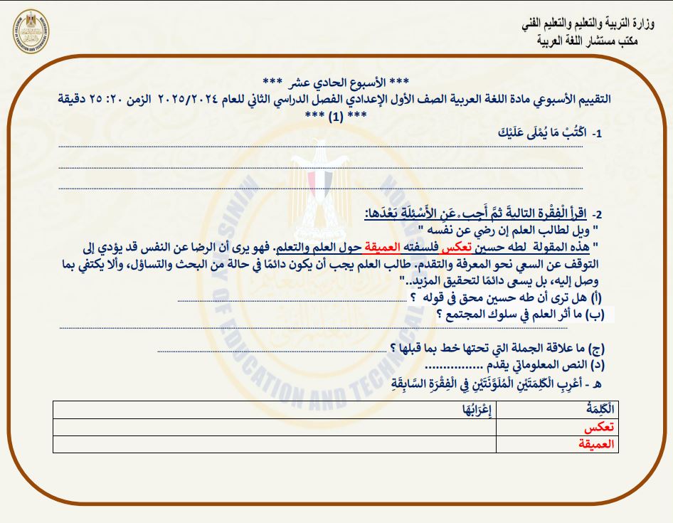 - تقييم الأسبوع الـ 11 لغة عربية أولى اعدادي ترم ثاني