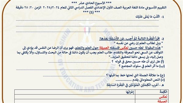 أولى اعدادي.. أسئلة تقييمات الأسبوع الـ 11 لغة عربية