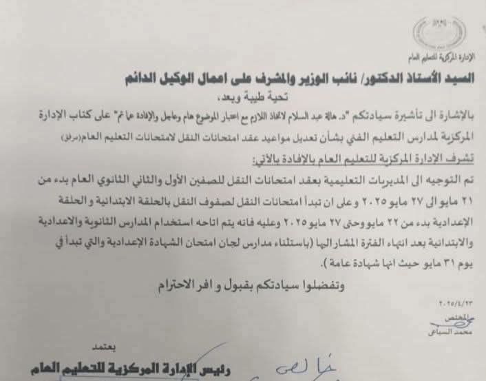 بالإشارة إلى تأشيرة سيادتكم الكريمة بتوجيه "الدكتورة/ هالة عبد السلام" لاتخاذ اللازم بشأن ما ورد بكتاب الإدارة المركزية لمدارس التعليم الفني، والمتعلق بتعديل مواعيد عقد امتحانات النقل بقطاع التعليم العام (مرفق)، مع التأكيد على أهمية الموضوع واعتباره عاجلًا، والإفادة بما تم اتخاذه من إجراءات.