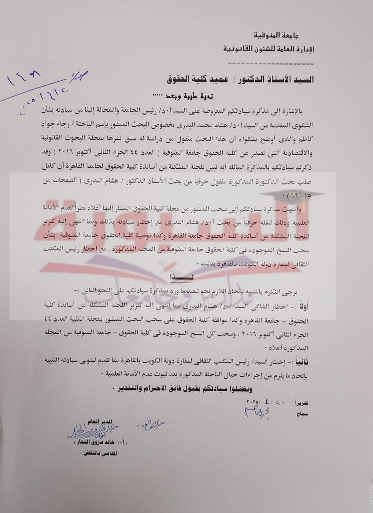 وانتهت مذكرة سيادتكم إلى سحب المنشور من مجلة كلية الحقوق المشار إليها أعلاه نظرًا لعدم الأمانة العلمية وذلك لنقله حرفيًا من بحث أ.د/ هشام البدري مع إخطار سيادته بذلك وبما انتهى إليه تقرير اللجنة المشكلة من أساتذة كلية الحقوق جامعة القاهرة وكذا توصية كلية الحقوق جامعة المنوفية بشأن سحب النسخ الموجودة في كلية الحقوق جامعة المنوفية من المجلة المذكورة، مع إخطار رئيس المكتب الثقافي السفارة دولة الكويت بالقاهرة بذلك.
