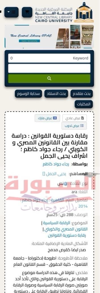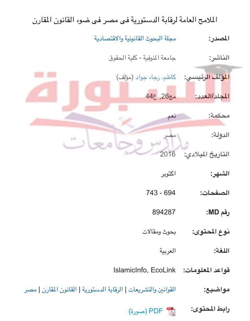 بالإشارة إلى مذكرة سيادتكم المعروضة على السيد أ.د/ رئيس الجامعة والمحالة إلينا من سيادته بشأن الشكوى المقدمة من السيد أ.د/ هشام محمد البدري بخصوص البحث المنشور باسم الباحثة / رجاء جواد كاظم والذي أوضح بشكواه أن هذا البحث منقول من دراسة له سبق نشرها بمجلة البحوث القانونية والاقتصادية التي تصدر عن كلية الحقوق جامعة المنوفية ( العدد ٤٤ الجزء الثاني أكتوبر ٢٠١٦ ) وقد ذكرتم سيادتكم بالمذكرة الما أنه تبين للجنة المشكلة من أساتذة كلية الحقوق جامعة القاهرة أن كامل صلب بحث الدكتورة المذكورة منقول حرفيًا من بحث الأستاذ الدكتور / هشام البدري، الصفحات ( من ١٥وحتى ٦٦ )