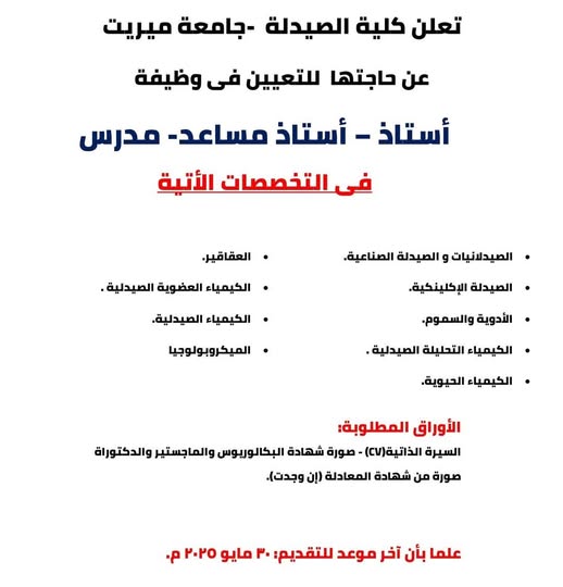 تعلن كلية الصيدلة جامعة ميريت عن حاجتها للتعيين في وظيفة أستاذ - أستاذ مساعد - مدرس في التخصصات الأتية: