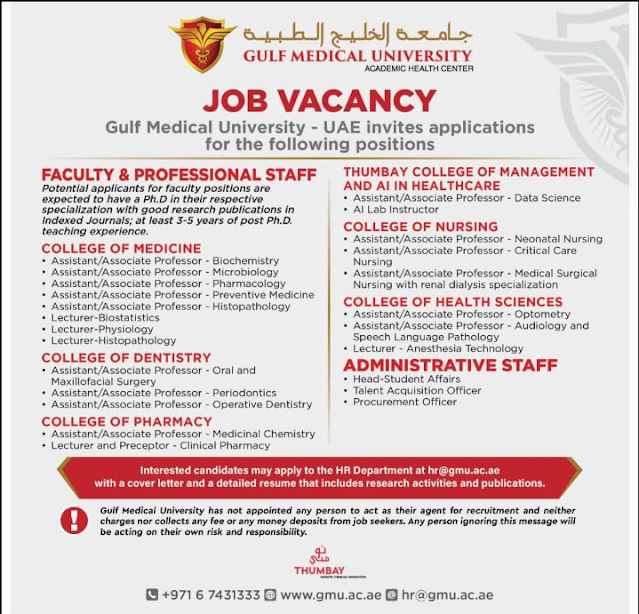 تدعو جامعة الخليج الطبية (GMU)، الكائنة في دولة الإمارات العربية المتحدة، حاليًا إلى التقديم لشغل الوظائف التالية لأعضاء هيئة التدريس والموظفين المهنيين. نحن نبحث عن أفراد مؤهلين وذوي خبرة، شغوفين بالمساهمة في التميز الأكاديمي لمؤسستنا.
