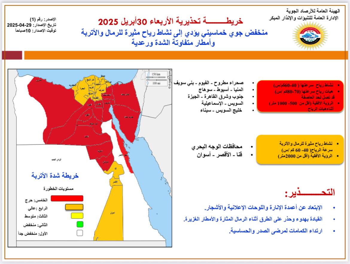 النهار هيقلب ليل و تعطيل الدراسة اليوم الاربعاء ، حذرت هيئة الارصاد الجوية اليوم من سوء حالة الطقس اليوم ، ونشرت خريطة تحذيرية لحالة طقس اليوم الموافق ٣٠ أبريل ٢٠٢٥، وقالت أنه من متوقع أن تتأثر البلاد بمنخفض خماسينى يصاحبه نشاط رياح مثيرة للرمال والأتربة وأمطارمتفاوتة الشدة تكون رعدية أحيانا بسبب العاصفة الترابية اليوم والتى من المتوقع أن تستمر