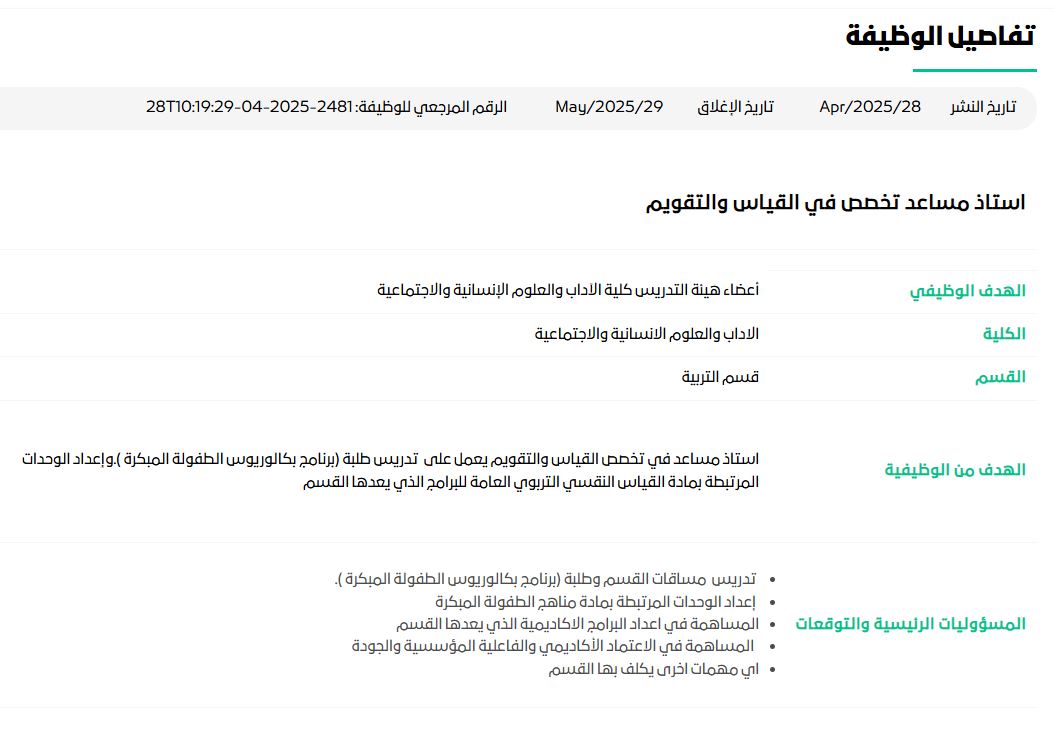 نبذة عن وظيفة استاذ مساعد تخصص في القياس والتقويم