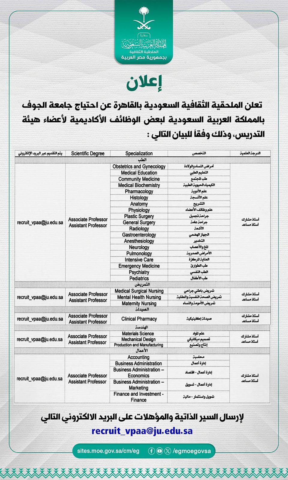 أعلنت الملحقية الثقافية السعودية بالقاهرة عن حاجة جامعة الجوف بالمملكة العربية السعودية لبعض الوظائف الأكاديمية من أعضاء هيئة التدريس للعام الدراسي 2025 من حملة الدكتوراه،أستاذ مساعد / أستاذ مشارك فى 31 تخصصا بخمس كليات وهى كليات، كلية الطب البشري، كلية التمريض، كلية الصيدلة، كلية إدارة الإعمال، كلية الهندسة وتنشر السبورة جميع التفاصيل والتخصصات ونص الأعلان وطريقة التقدم فى هذا التقرير