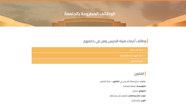 وظيفة جامعة .. أعلنت جامعة اليمامة، إحدى الجامعات التعليمية الرائدة في المملكة العربية السعودية، عن فتح باب التقديم لشغل وظائف أكاديمية في كلية الاعمال وكلية القانون وكلية الهندسة والعمارة وفقا لنص الإعلان التالي: