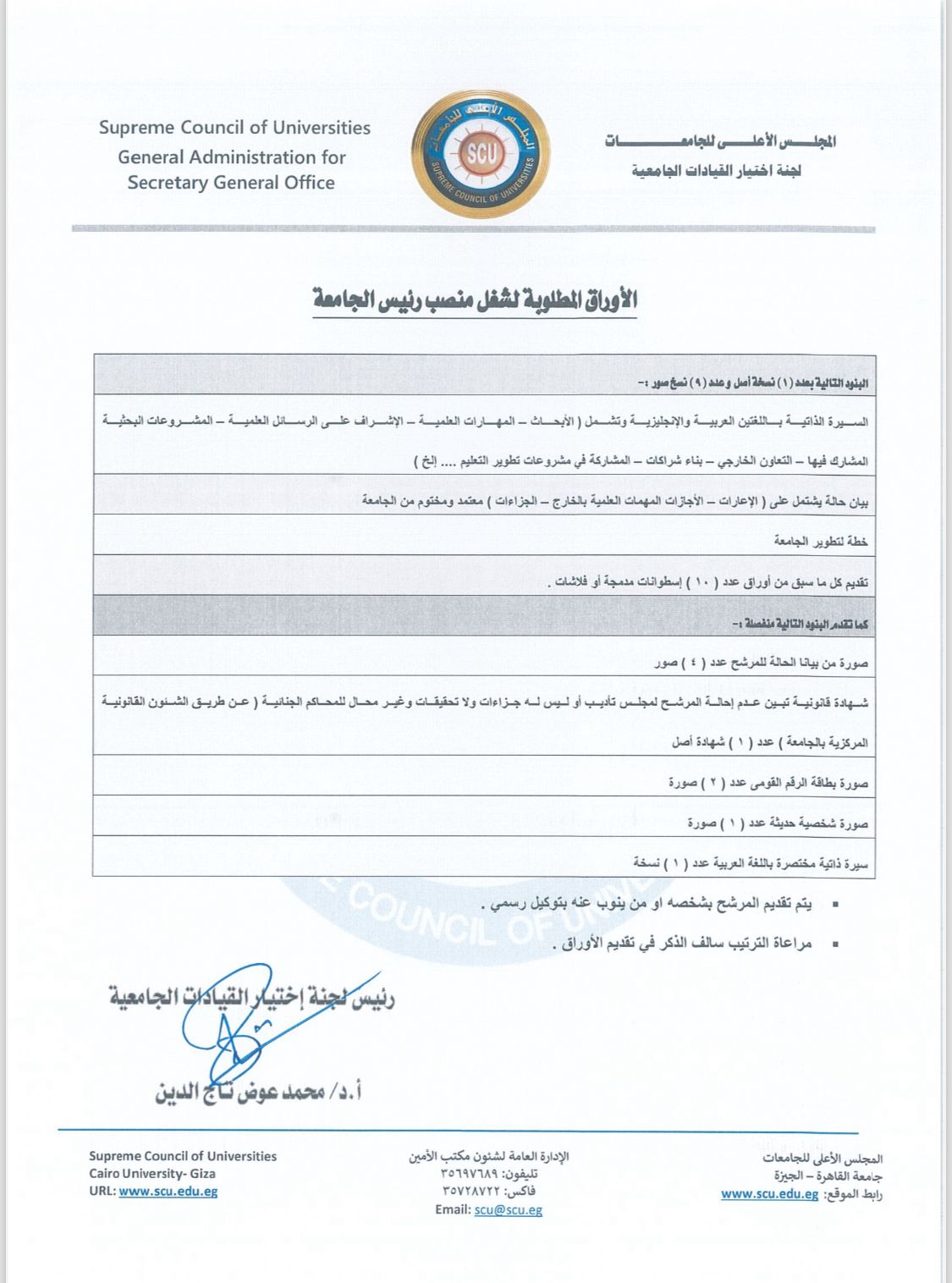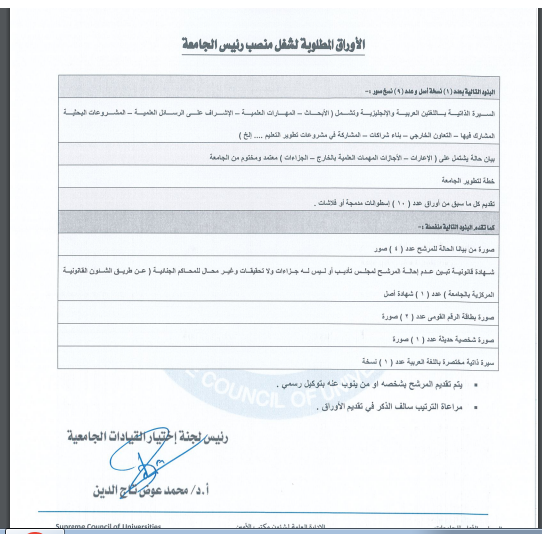 الأوراق المطلوبة لشغل منصب رئيس الجامعة