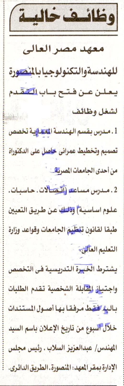 يعلن معهد مصر العالي للهندسة والتكنولوجيا بالمنصورة عن فتح باب التقدم لشغل وظائف أعضاء هيئة التدريس من مدرس ومدرس مساعد، وعلى الراغبين في الحصول على وظائف معهد مصر العالي للهندسة والتكنولوجيا، التواصل من خلال مقر معهد مصر العالي للهندسة والتكنولوجيا.