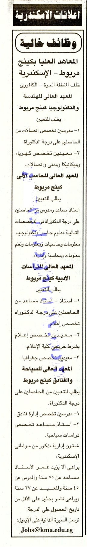 يطلب المعهد العالي للحاسب الآلى كينج مريوط التعيين استاذ مساعد ومدرس من الحاصلين على درجة الدكتوراة في التخصصات التالية (علوم حاسب وتكنولوجيا معلومات وحاسبات ومعلومات ونظم معلومات ومحاسبة وادارة).