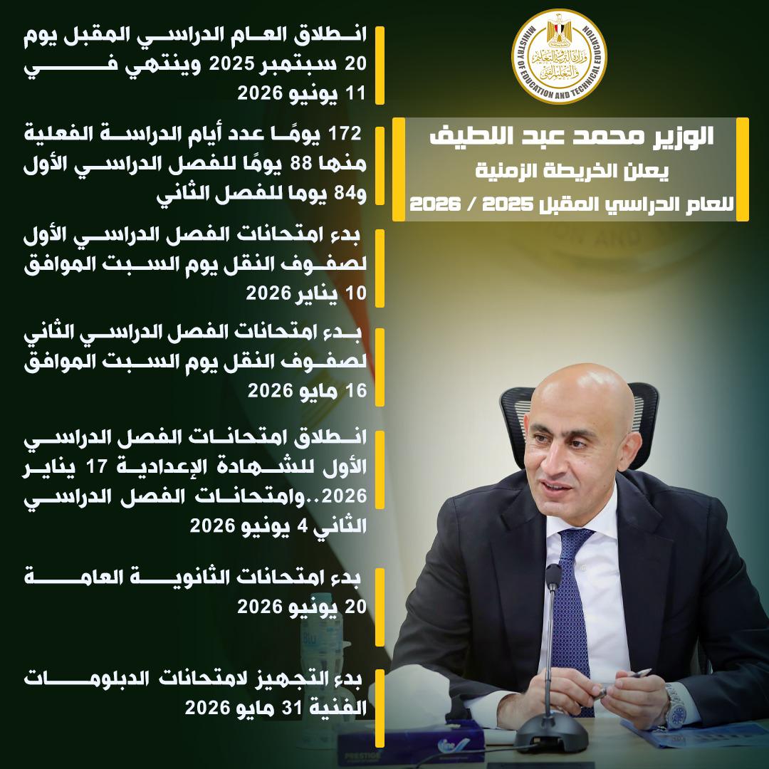 العام الدراسي الجديد ، كما استعرض الوزير الخريطة الزمنية للعام الدراسي 2025 / 2026، والذي يبدأ في 20 سبتمبر 2025 وينتهي في 11 يونيو 2026، بواقع 36 أسبوعًا دراسيًا، ويتم توزيع المناهج على الفصلين الدراسيين، حيث سيبدأ الفصل الدراسي الأول في 20 سبتمبر 2025 وحتى 22 يناير 2026، وتبدأ امتحانات الفصل الدراسي الأول لصفوف النقل يوم السبت الموافق 10 يناير 2026، ويبدأ الفصل الدراسي الثاني يوم السبت الموافق 7 فبراير 2026 إلى الخميس الموافق 11 يونيو 2026 على أن يكون موعد بدء امتحانات الفصل الدراسي الثاني لصفوف النقل يوم السبت الموافق 16 مايو 2026.