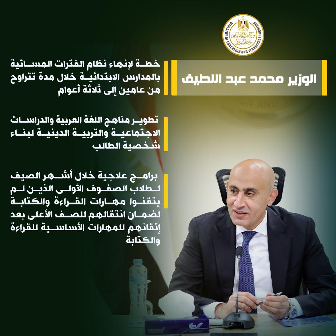 وخلال الاجتماع، استعرض الوزير ملامح خطة الوزارة للعام الدراسي الجديد، مشددًا على أن واقع التعليم يقاس بما يحدث داخل الفصل الدراسي، ومشيرًا إلى أن الجهود التي بذلتها الوزارة خلال الفترة الماضية أسهمت بشكل مباشر في تحقيق نسب حضور مرتفعة حتى هذا الوقت من العام الدراسي تتراوح بين 80% إلى 90%، فضلًا عن أن كثافة الفصول لا تتعدى 50 طالبًا في الفصل الواحد، كما وضعت الوزارة خطة لإنهاء نظام الفترات المسائية بالمدارس الابتدائية خلال مدة تتراوح من عامين إلى ثلاثة أعوام.