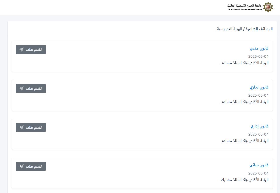 تعلن جامعة العلوم الاسلامية العالمية، بالمملكة الأردنية الهاشمية، عن حاجتها إلى أعضاء هيئة التدريس، وعلى الراغبين في الحصول على وظائف جامعة العلوم الاسلامية العالمية، التقديم عبر موقع جامعة العلوم الاسلامية العالمية، على شبكة الانترنت، والتقديم متاح الآن.