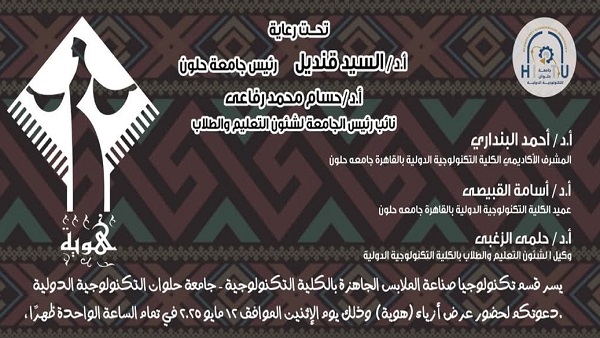 في إطار التوجه الاستراتيجي نحو تعزيز الإبداع الطلابي وربط التعليم التكنولوجي بواقع سوق العمل، تنظم جامعة حلوان التكنولوجية الدولية فعالية فنية متميزة تحت عنوان "هوية"، يقدمها برنامج تكنولوجيا صناعة الملابس الجاهزة التابع للكلية التكنولوجية، حيث يُعد هذا الحدث فرصة حقيقية لإبراز الطاقات الفنية ومهارات التصميم لدى الطلاب في مجال الملابس الجاهزة والصناعات الإبداعية.