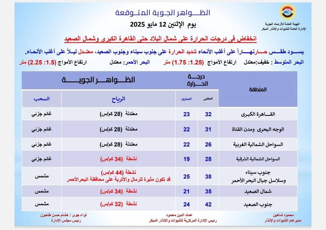 حالة الطقس المتوقعة غداً الإثنين 12 مايو 2025 فى مصر