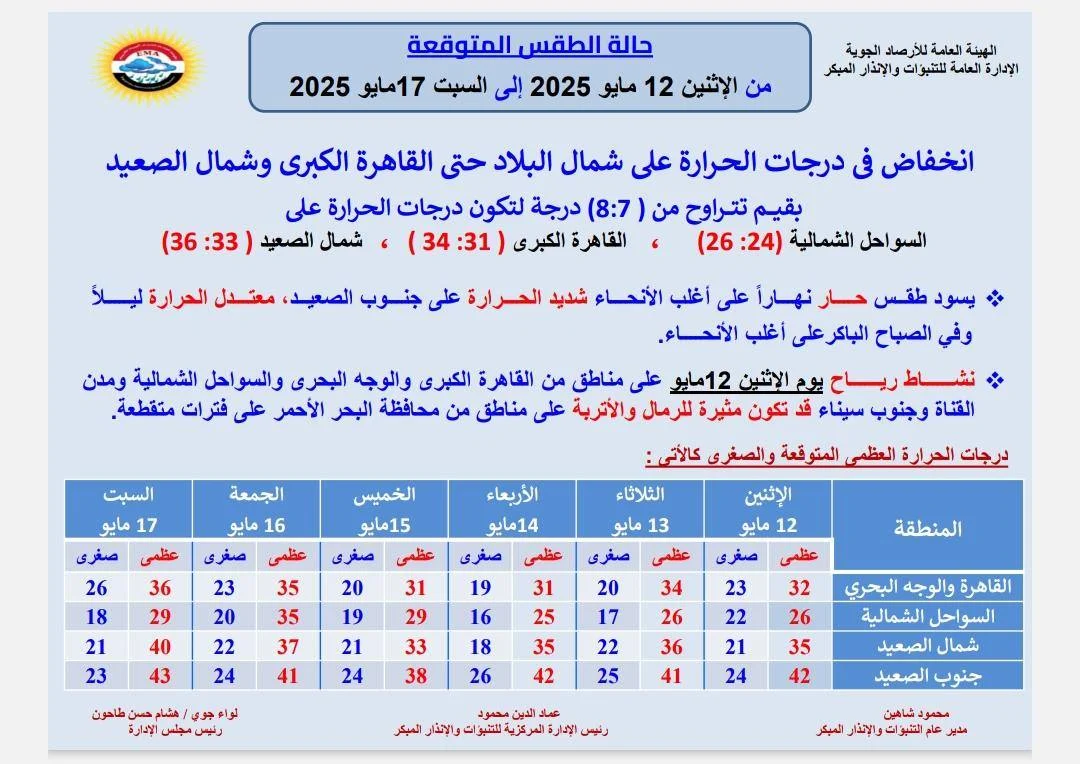حالة الطقس غدًا الإثنين في محافظات القاهرة.. في ظل التقلبات الجوية والمناخية خلال الأيام الماضية، والأمر الذي يثير تساؤلات المواطنين والمسافرين من حالة الطقس بشكل يومي، لذلك يبحثون درجات الحرارة غدا الإثنين 12 مايو 2025، بعد ارتفاع درجة الحرارة بشكل كبير اليوم، ولذلك تستعرض موقع «السبورة» خلال السطور التالية حالة الطقس غدا، ودرجة الحرارة في كل محافظة على حدة.