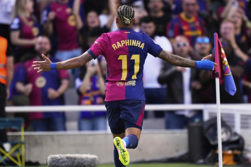 وقبل نهاية الشوط الأول، عاد رافينيا مجددًا ليوقع على الهدف الرابع للبلوغرانا في الدقيقة 45، منهيًا الشوط الأول بتقدم كتالوني كبير بنتيجة 4-2.