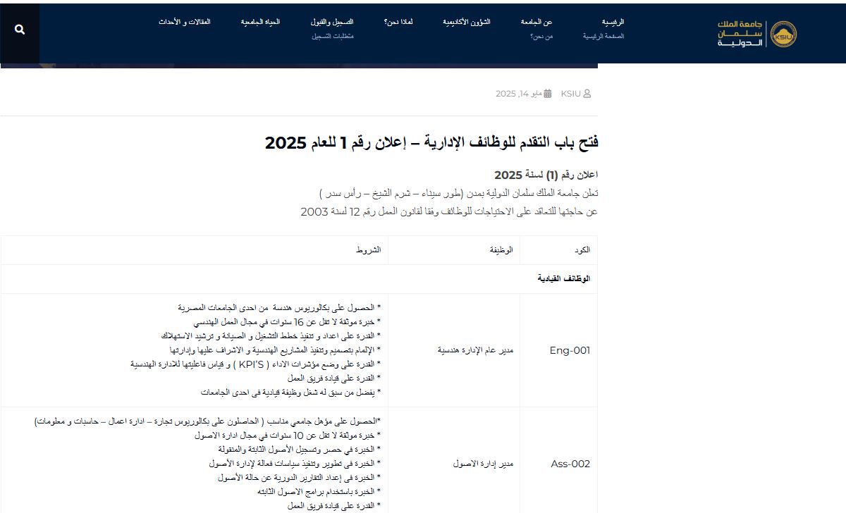 لا يجوز التقديم لمن تم توظيفه وانتهت خدمته بجامعة الملك سلمان الدولية بفروعها الثلاث ( طور سيناء- شرم الشيخ- راس سدر ) قبل الإعلان