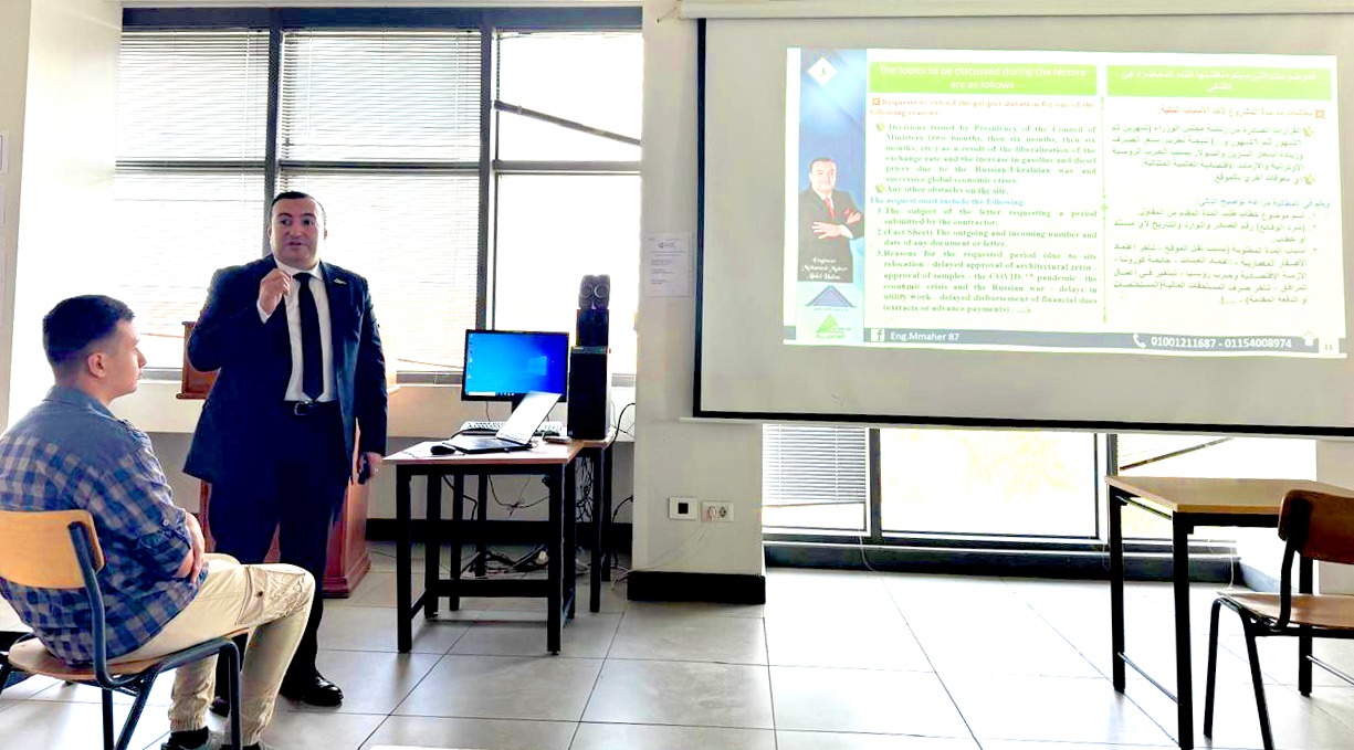 استضاف برنامج الهندسة المدنية بـ الجامعة الألمانية بالقاهرة المهندس محمد ماهر عبدالحليم، مدير عام متابعة المشروعات والقائم بأعمال رئيس القطاع الفني بالشركة القابضة للتشييد والتعمير، لإلقاء محاضرة على طلاب البرنامج بعنوان:"دراسة حالة من المطالبات والمنازعات في عقود التشييد".