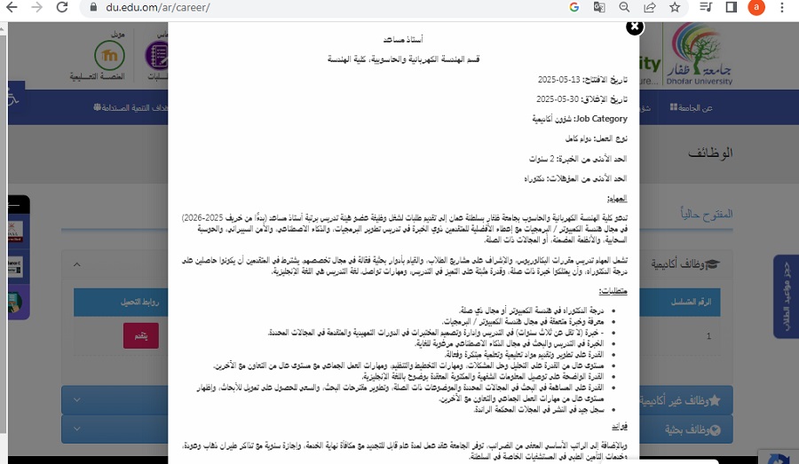 لمطالعة نص إعلان وظيفة جامعة ظفار والتقديم اضغط هنا