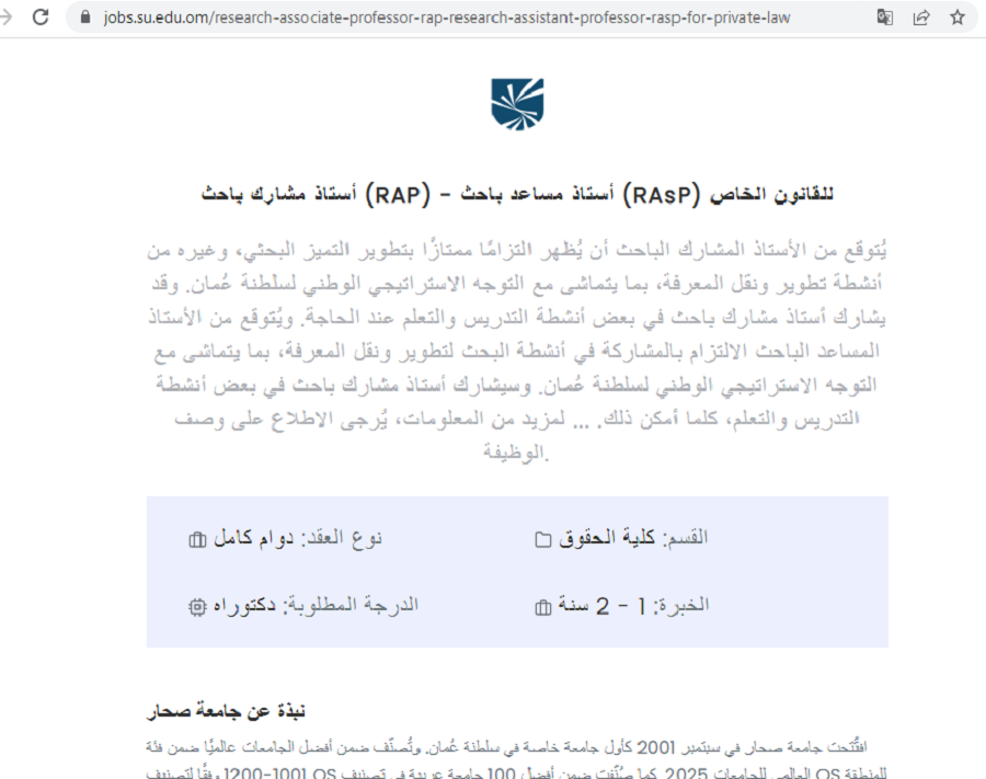 وظيفة جامعة .. أعلنت جامعة صحار، إحدى أبرز الجامعات الخاصة في سلطنة عُمان، عن فرص عمل أكاديمية متميزة للعام الأكاديمي الحالي، حيث فتحت باب التقديم على وظائف أستاذ مشارك باحث (RAP) وأستاذ مساعد باحث (RAsP) في تخصص القانون الخاص ضمن كلية الحقوق.