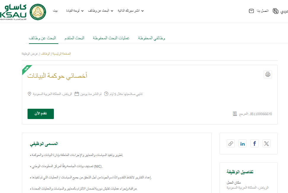للمهتمين بالتقديم على الوظيفة، يرجى متابعة موقع التوظيف الرسمي الخاص بجامعة الملك سعود أو عبر بوابة Jadarah أو المنصة الوطنية الموحدة للتوظيف.