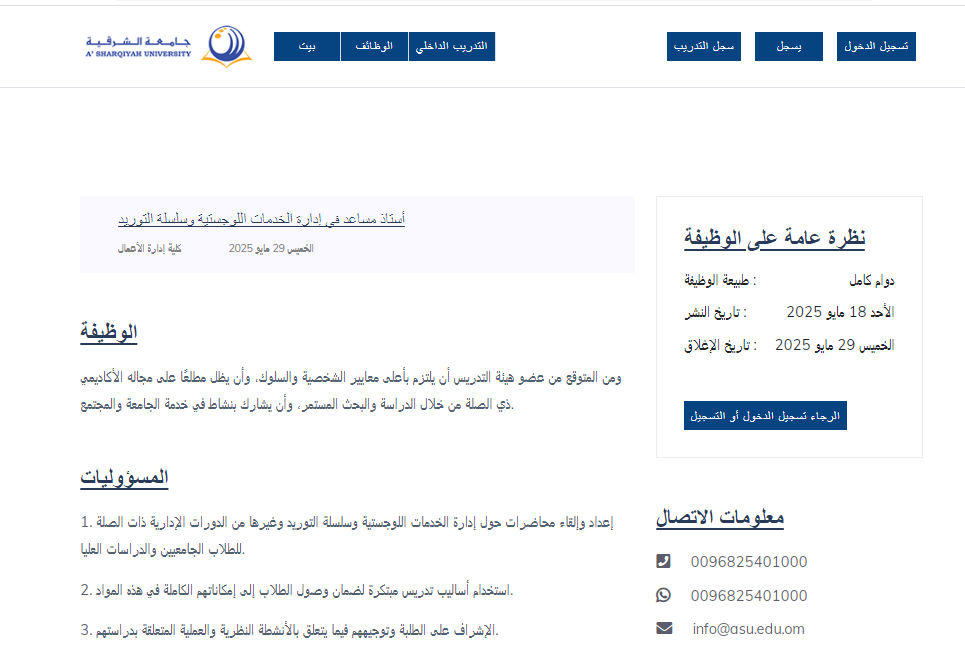 وظيفة جامعة .. أعلنت جامعة الشرقية بسلطنة عمان عن حاجتها لتعيين أستاذ مساعد في تخصص إدارة السجلات والمحفوظات للعمل ضمن كوادر كلية إدارة الأعمال، على أن يبدأ العمل اعتبارًا من الثلاثاء الموافق 20 مايو 2025. وتأتي هذه الوظيفة ضمن إطار سعي الجامعة إلى تعزيز كادرها الأكاديمي بأعضاء هيئة تدريس ذوي كفاءة عالية والتزام أكاديمي ومهني.