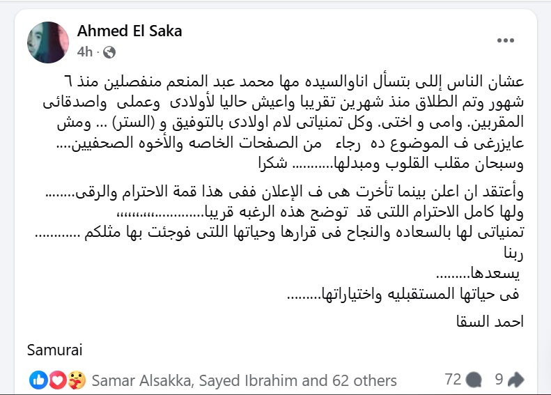 ونشر الفنان احمد السقا عبر حسابه الشخصي على موقع التواصل الاجتماعي "عشان الناس اللى بتسأل أنا والسيدة مها محمد عبد المنعم منفصلين منذ 6 شهور وتم الطلاق منذ شهرين تقريبا وأعيش حاليًا لأولادى وعملى وأصدقائى المقربين، وأمى وأختى، وكل تمنياتى لأم أولادى بالتوفيق والستر، ومش عايز رغى فى الموضوع ده رجاء من الصفحات الخاصة والأخوة الصحفيين، وسبحان مقلب القلوب ومبدلها، شكرًا".