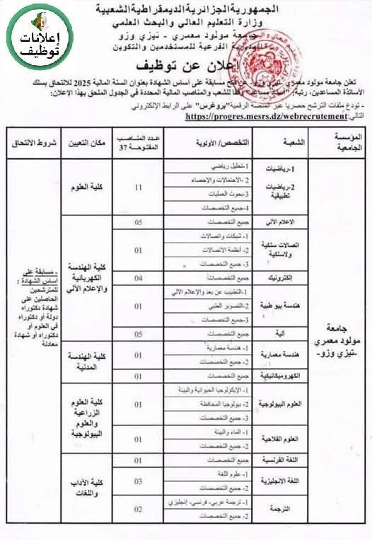 جامعة مولود معمري بـ الجزائر تعلن حاجتها إلى أعضاء هيئة التدريس